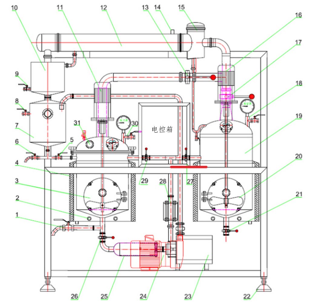 25.管道過濾器; 26.出料閥; 27.濃縮罐進料閥; 28.管路視鏡; 29.熱回流閥; 30.放氣閥; 31.投料口