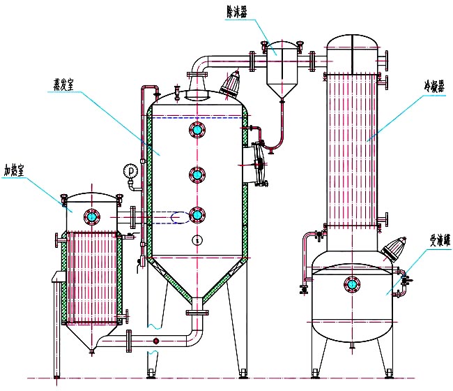 單效外循環真空濃縮器,由加熱器、蒸發器、除沫器、冷凝器、冷卻器、受液罐等組成,凡與物料接觸部件均采用優質不銹鋼制作,本設備